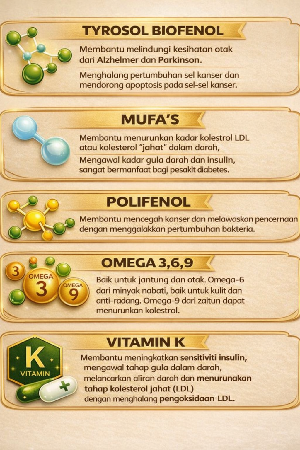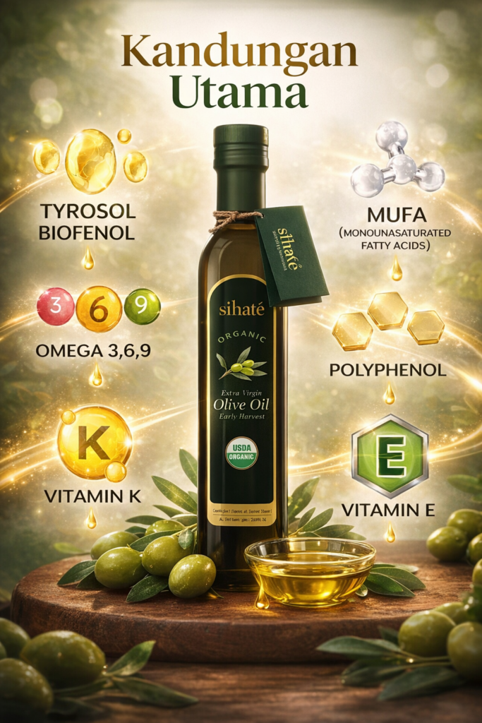 EVOO Sihaté kaya dengan polifenol, antioksidan, dan lemak tak tepu yang membantu meningkatkan sensitiviti insulin, mengurangkan tekanan darah, dan menurunkan kolesterol jahat (LDL).