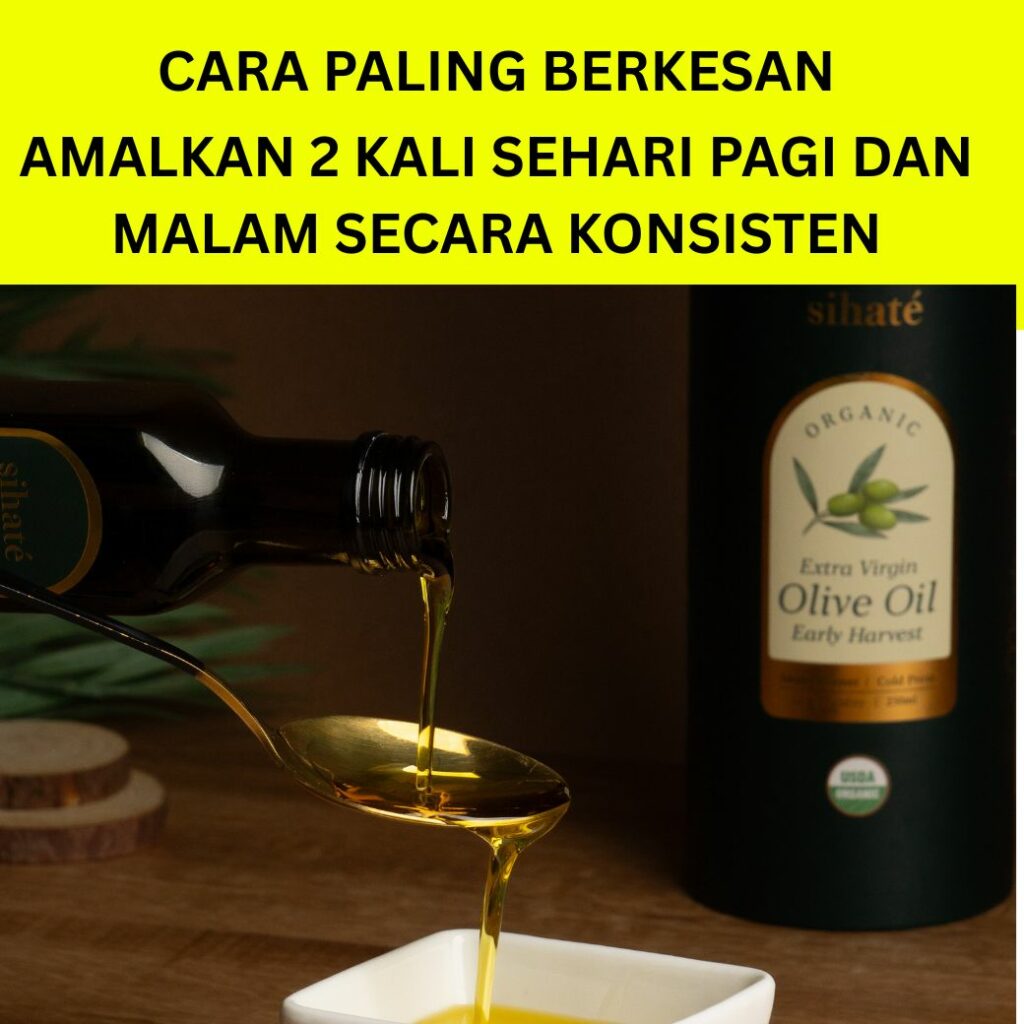 Waktu yang terbaik adalah 1 sudu besar (15ml) waktu pagi sebelum makan & 1 sudu besar (15ml) sebelum tidur. Untuk kesan yang pantas, minum segelas air kosong selepas pengambilan minyak zaitun.